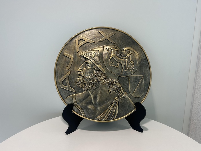 Bij dit item krijg je ook een Ajax-schild. Dit is een bronzen/gouden schildornament met het klassieke Ajax-logo. De diameter is 50 centimeter.